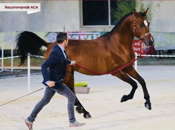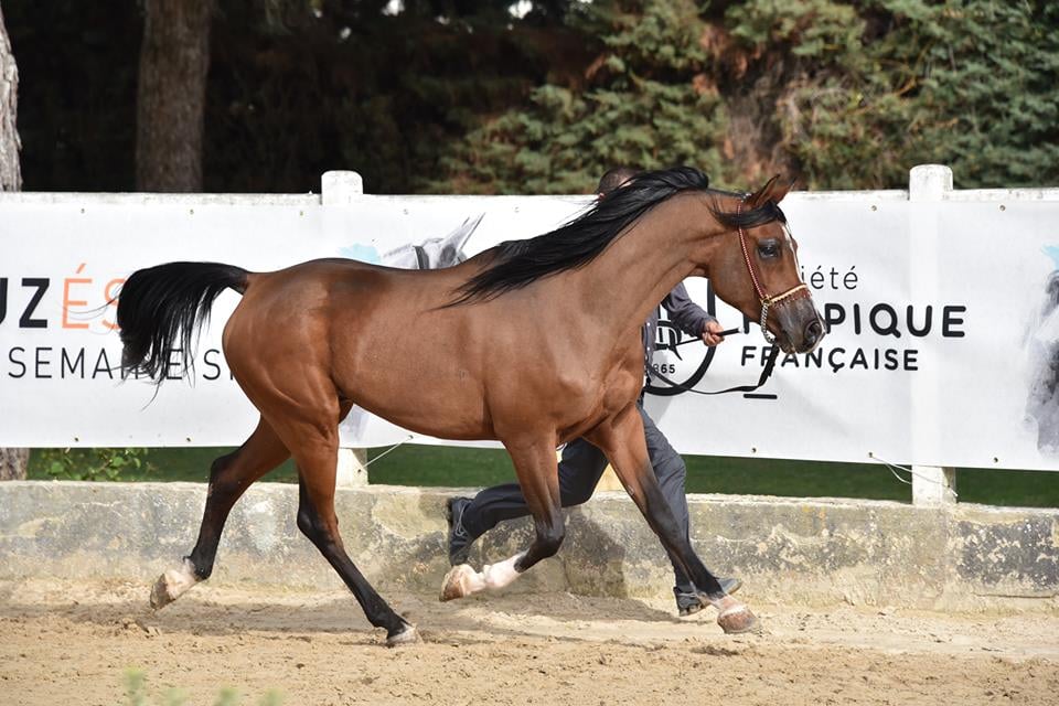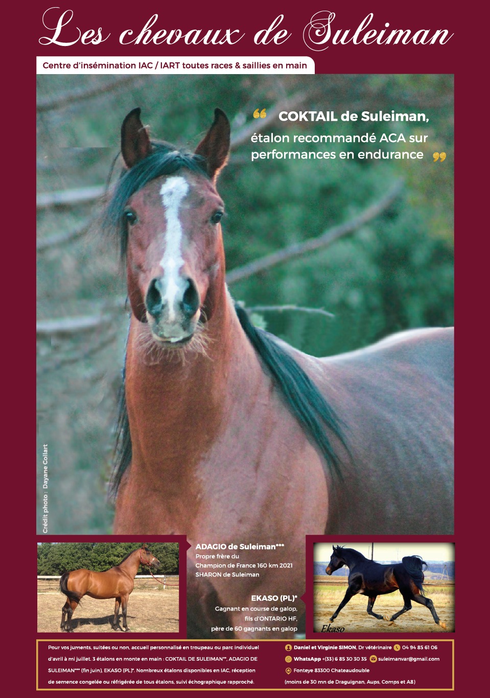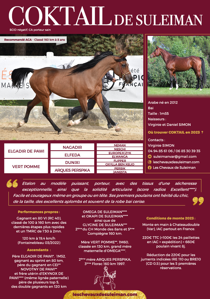 Etalon arabe (2012) (155 cm) issu de l’élevage Suleiman par Elgadir de Pawi et Vert Pomme, qualifié 160 km à Fontainebleau à 8 ans, classé sur 120 km à 7 ans, en novembre 2019 à Pamiers, à plus de 18 km/h, avec une récupération cardiaque remarquable. TMRC (Temps Moyen de Récupération Cardiaque) : 2 minutes par Vet Gate et moins de 4 minutes au final (trois dernières étapes au dessus des 20 km/h).