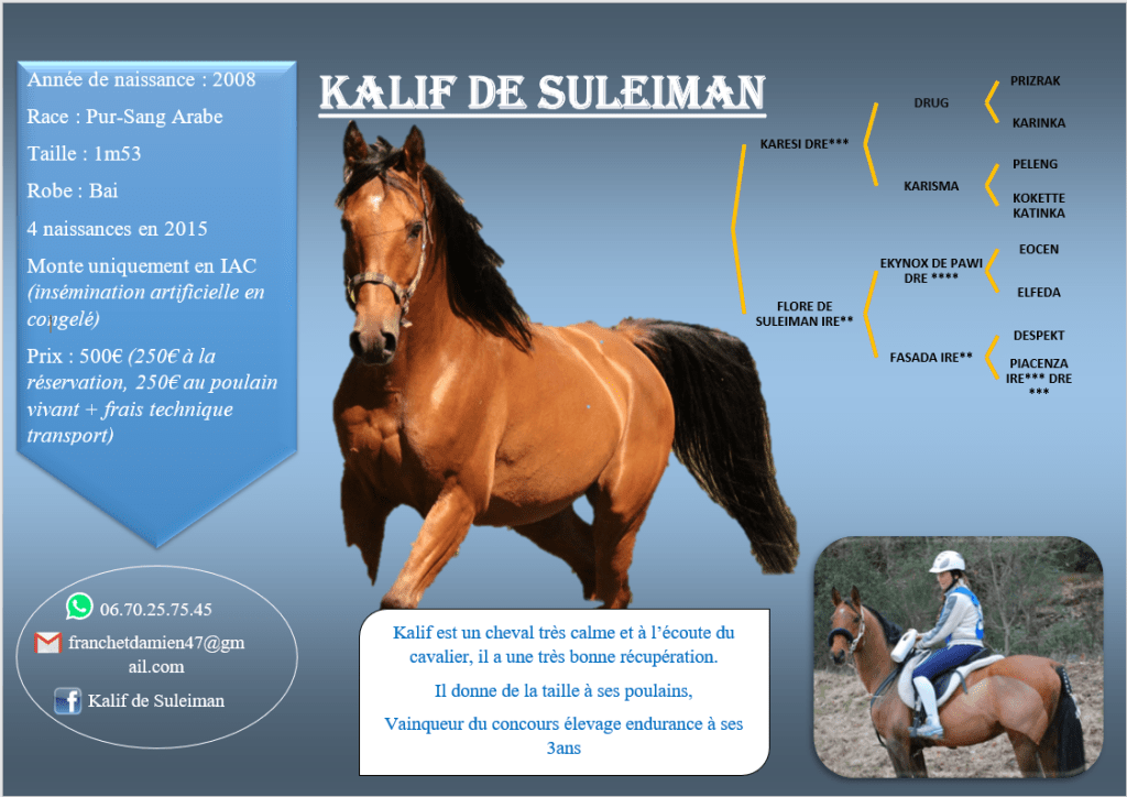 Kalif* est père de Gin Fizz Suleiman* top ten en 100 km et Gamin de Suleiman* podium en 80 km, ils ont 7 ans ce n’est que le début ! Seulement quelques produits, avec de la taille, gentils, excellents aplombs. Disponible en IAC.